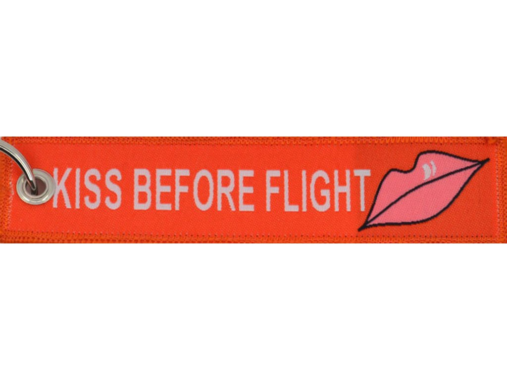 MegaKey - přívěsek "KISS BEFORE FLIGHT"- tkaný, červený, 13 x 3 cm
