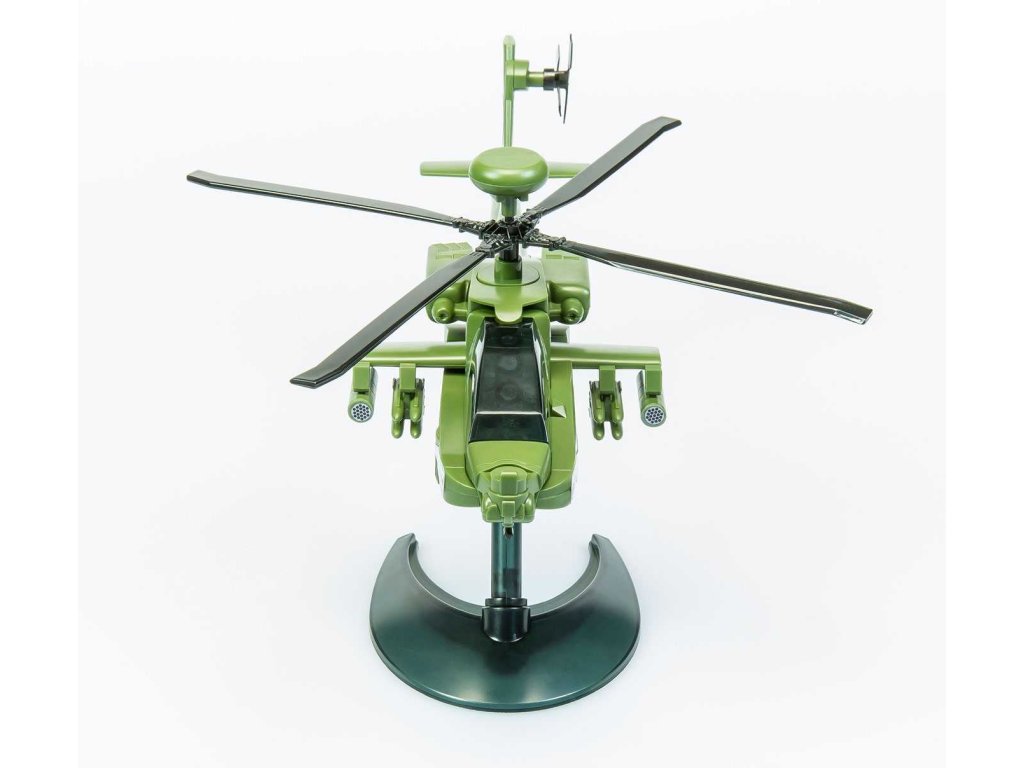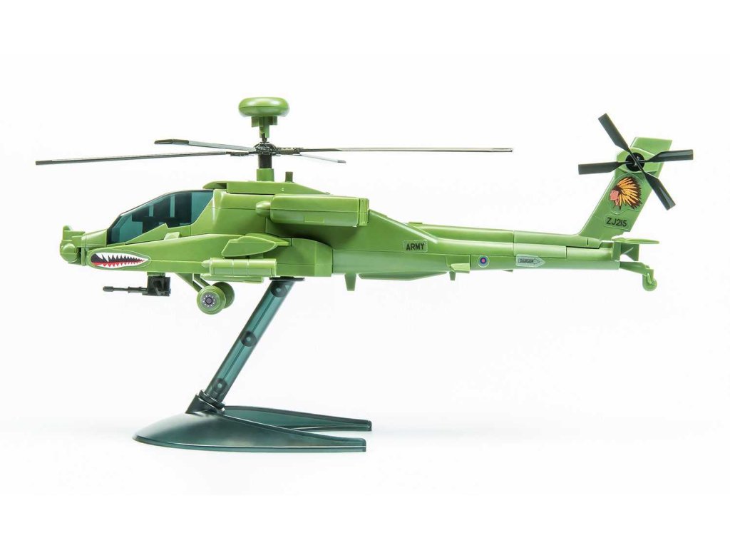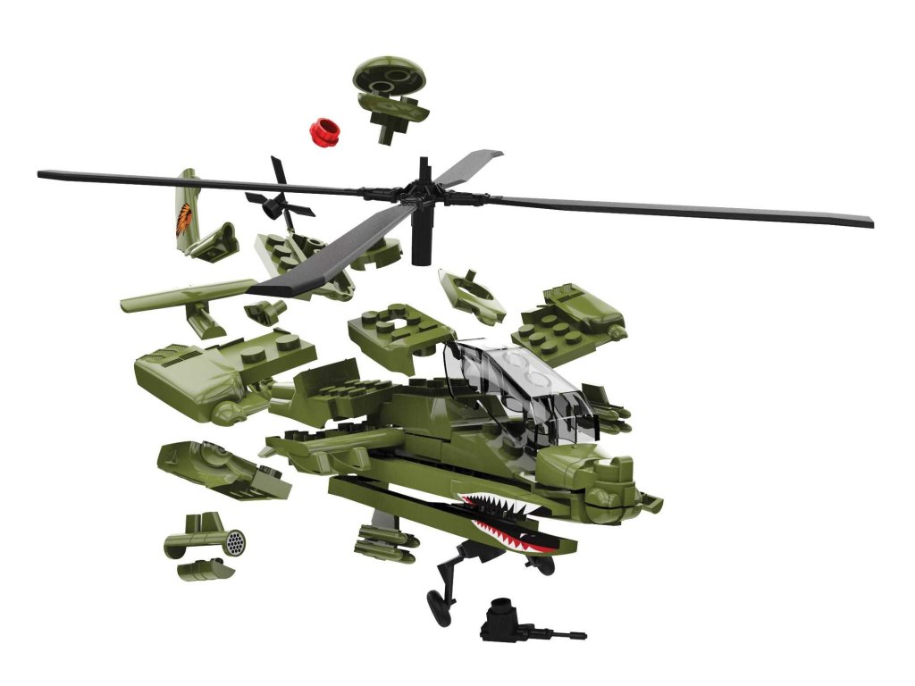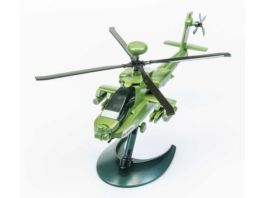 Sestavte si svůj vlastní vrtulník Apache! Tento model dvoumotorové útočné helikoptéry se může pochlubit otáčejícím se hlavním i ocasním čtyřlistým rotorem. Jak jinak než v pravé vojenské zelené. Tento kousek má i se stojánkem na výšku 129 mm. Skládá se z celkem 37 částí, stojánek pak z dalších 3.