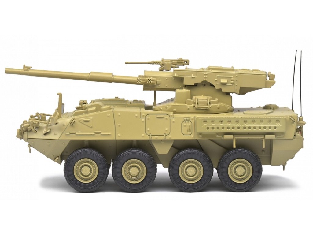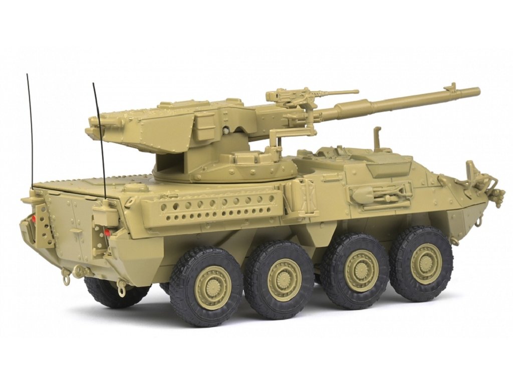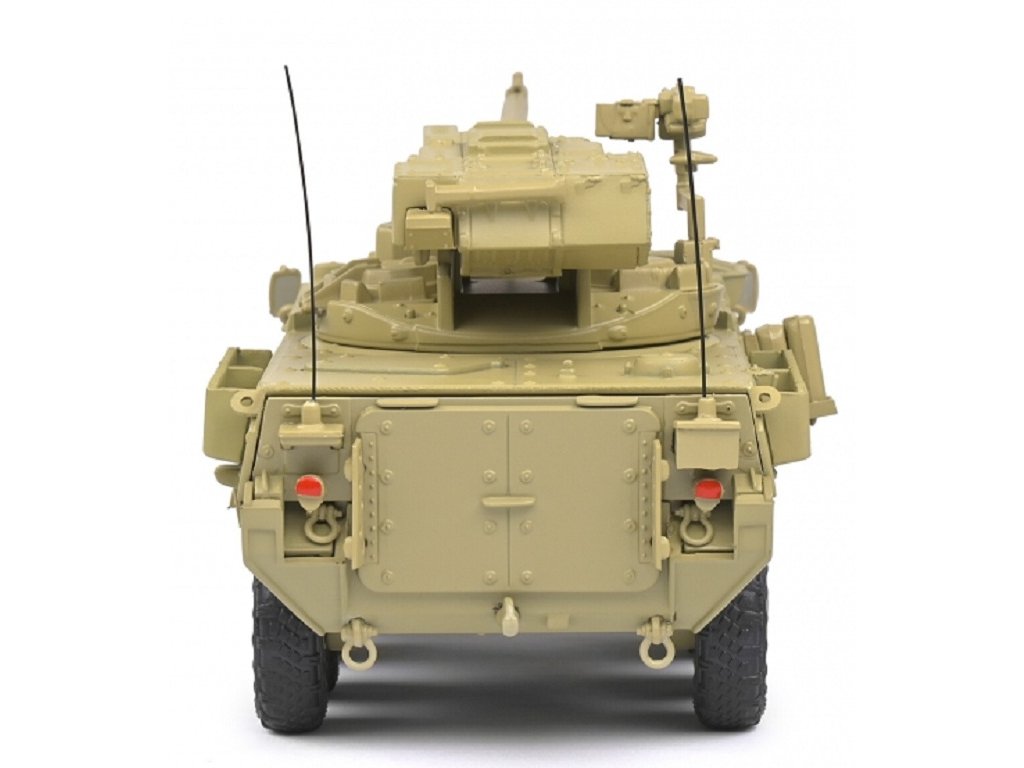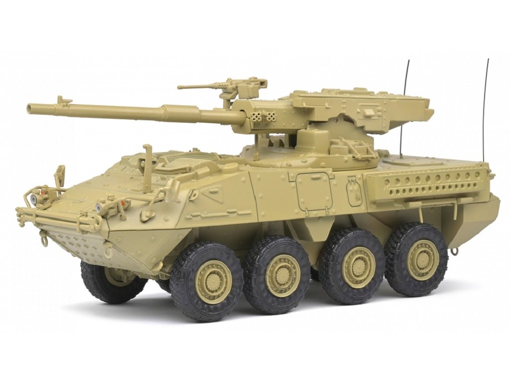 Propracovaný hotový kovový model amerického obrněného bojového vozidla M1128 Stryker MGS, maskování Desert Camo