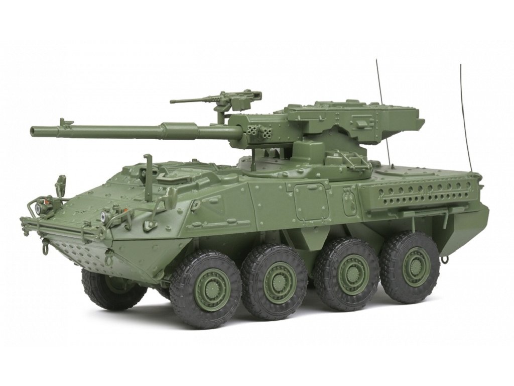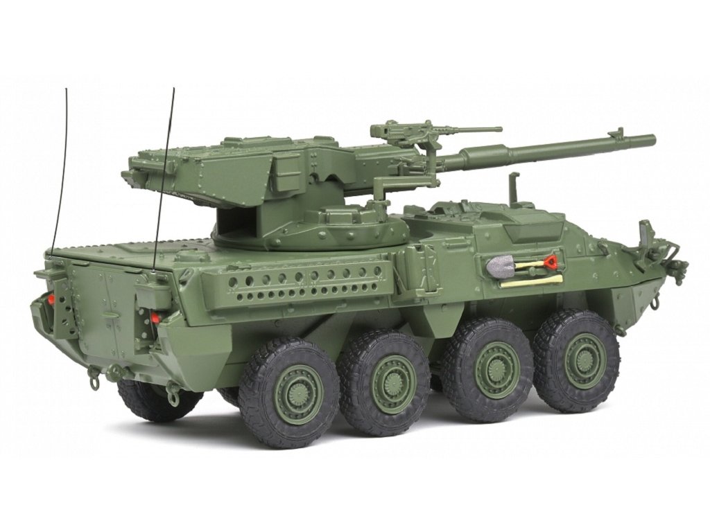 Propracovaný hotový kovový model amerického obrněného bojového vozidla M1128 Stryker MGS, maskování Green Camo