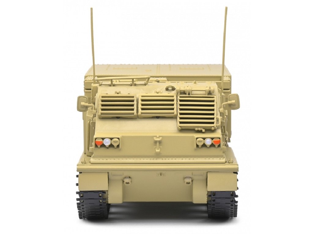 Propracovaný hotový kovový model amerického raketového systému M270A1 MLRS maskování Desert Camo