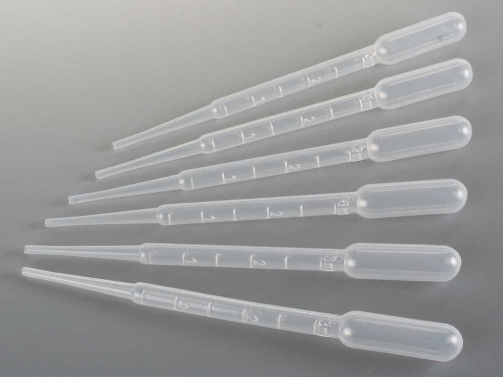 Sada šesti pipet s mililitrovou stupnicí pro přesné odměřování barev a ředidel.