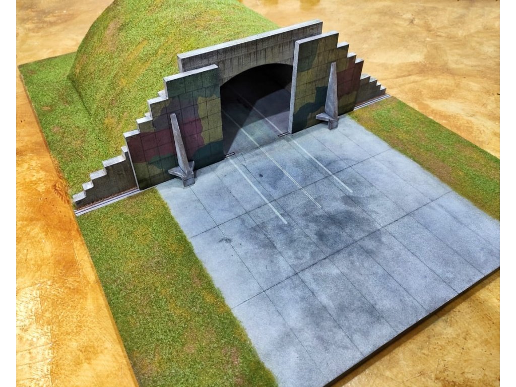 Podložka pro vytváření diorámat s hangárem. Vnitřní osvětlení je na baterie, hangár má posuvná vrata.