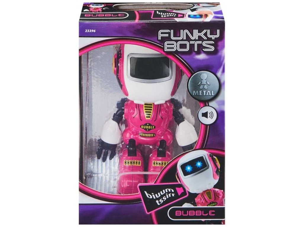 Tobi, Marvin a Bubble: to jsme my, noví Funky Boti! Dotkni se našeho čela a popovídáme si s tebou. Mluvíme, žvatláme a smějeme se naším vlastním robotím jazykem. Jsme rádi, když můžeme stát na tvém stole nebo s tebou jít za tvými kamarády - a hned jak nás uslyšíš mluvit a podíváš se nám do našich svítících očí, dostaneš zaručeně dobrou náladu. Části našich těl jsou vyrobené z kovu a bez problémů s nimi dokážeme hýbat. Pokud si nás zrovna nevšímáš, po chvíli se automaticky vypneme a ušetříme si tak energii. Probudit nás můžeš zmáčknutím tlačítka, které máme vzadu na hlavě